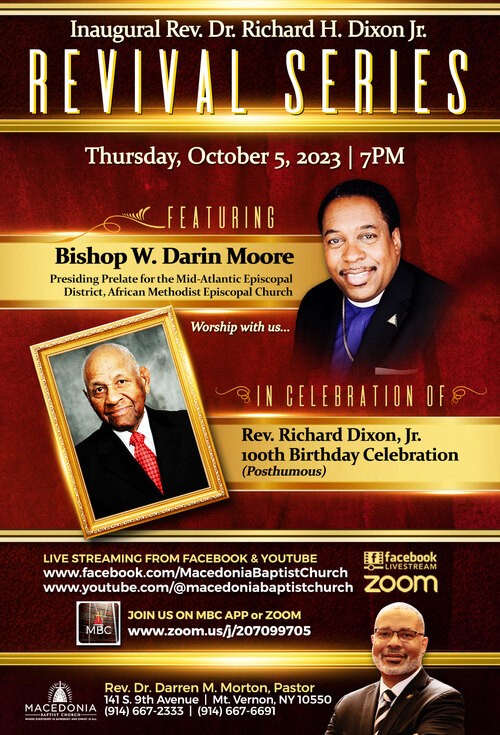 MBC Apple Picking DayThe SO SEND I YOU, INC. Dialogue Series are back in sessionThe BIG E Afterschool ProgramMacedonia Baptist Church 2023 HomecomingNew Members GatheringAppreciation DayRev. Dixon Revival SeriesOctober 2023 Pray Calendar and LessonThe Promises of God Prayer ServiceEarly Bird SERVICE